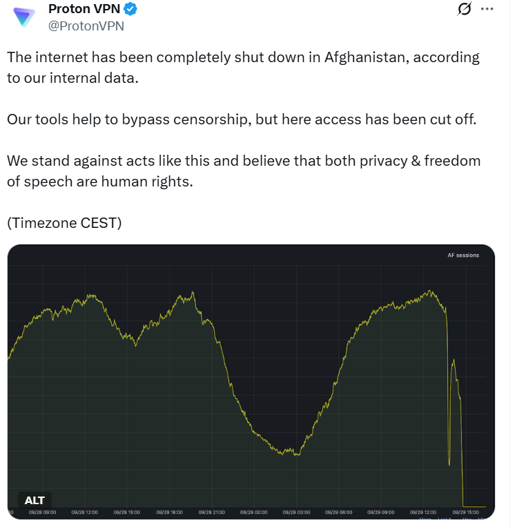The country suffered a near-total internet shutdown that lasted about 48 hours before connectivity was restored on Oct. 1, Reuters reported. The disruption was reportedly ordered by the Taliban administration, though officials later blamed “technical issues” involving fiber optic cables.