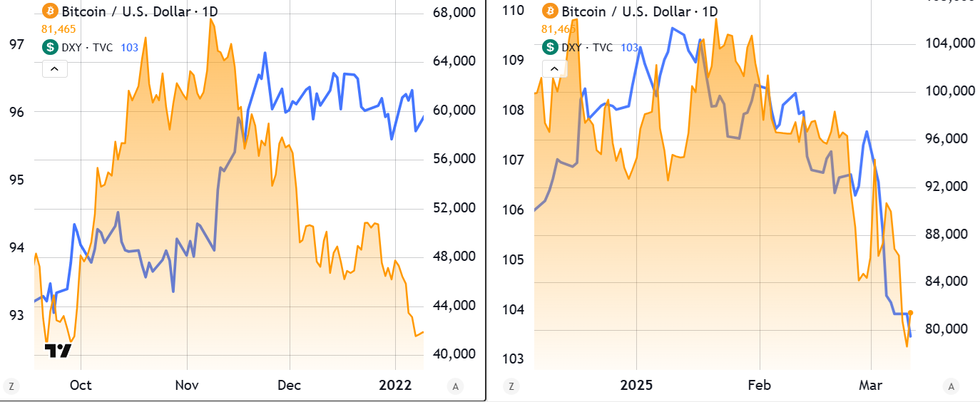 DXY (left, blue) vs. BTC/USD (right). Nov. 2021 vs. Feb. 2025. Source: TradingView / Cointelegraph