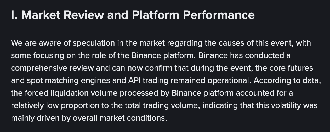 On Sunday, Binance released a “statement on recent market volatility” to address user concerns. The exchange wrote that it conducted a “comprehensive review” that confirmed its “core futures” remained operational during the market downturn.