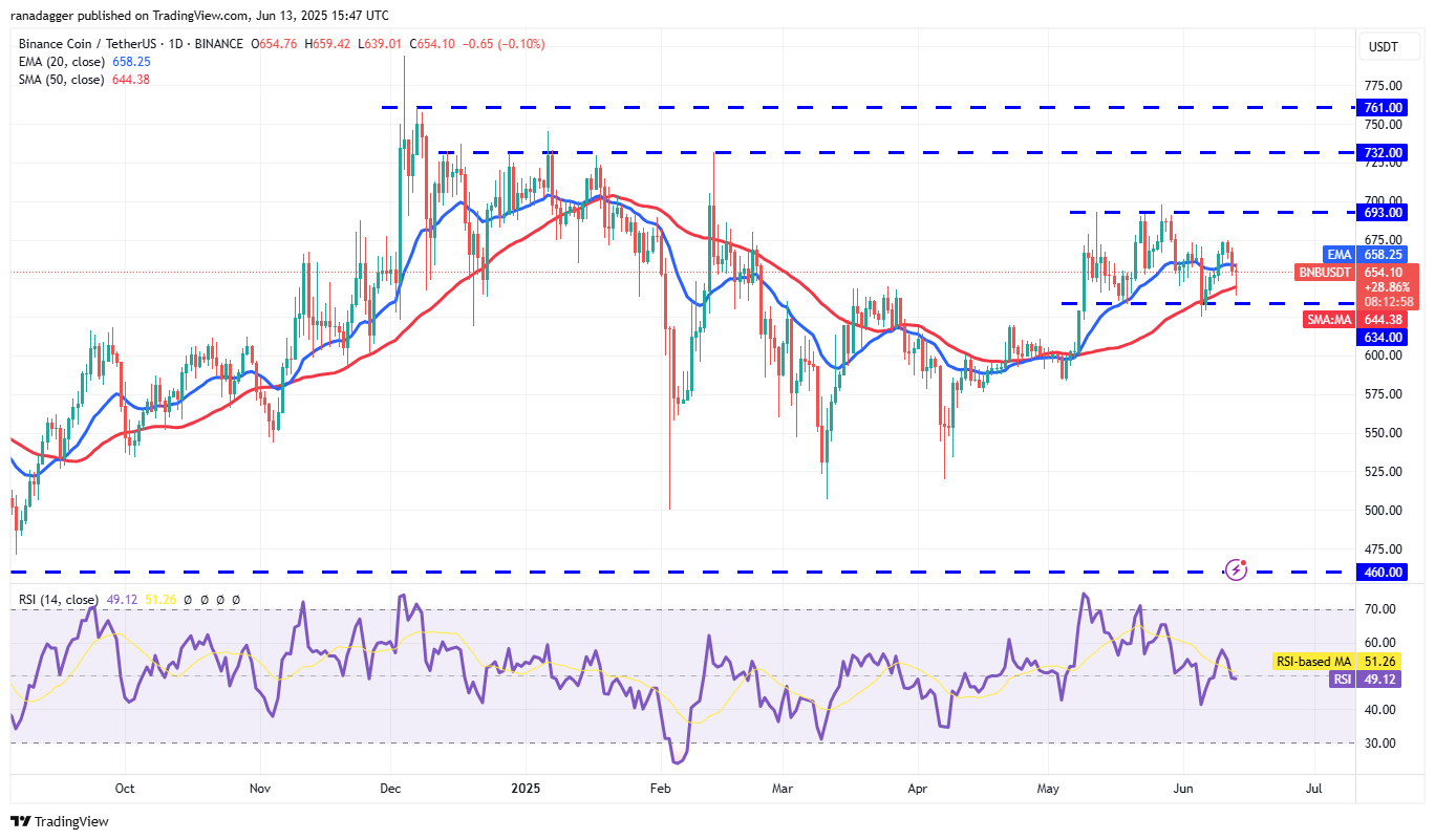 The flattish 20-day EMA ($658) and the RSI near the midpoint do not give a clear advantage either to the bulls or the bears. If the price turns up from $634 and rises above the 20-day EMA, the BNB/USDT pair could remain inside the range for some more time.