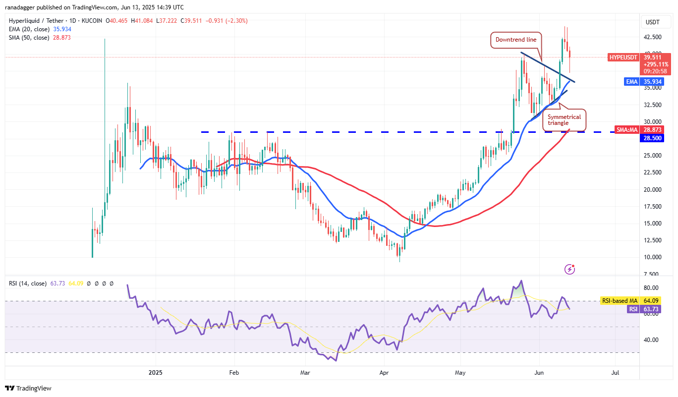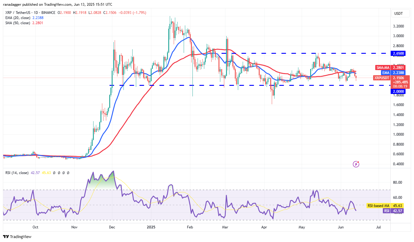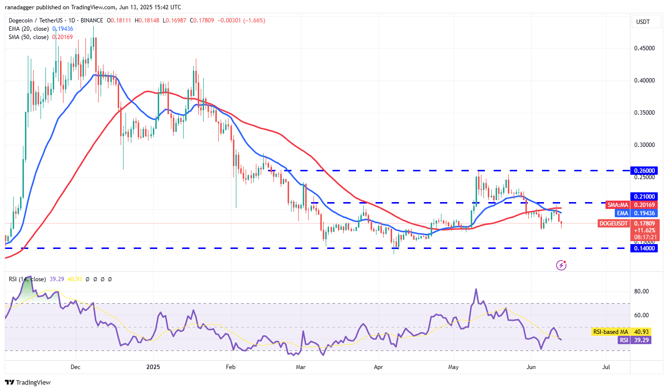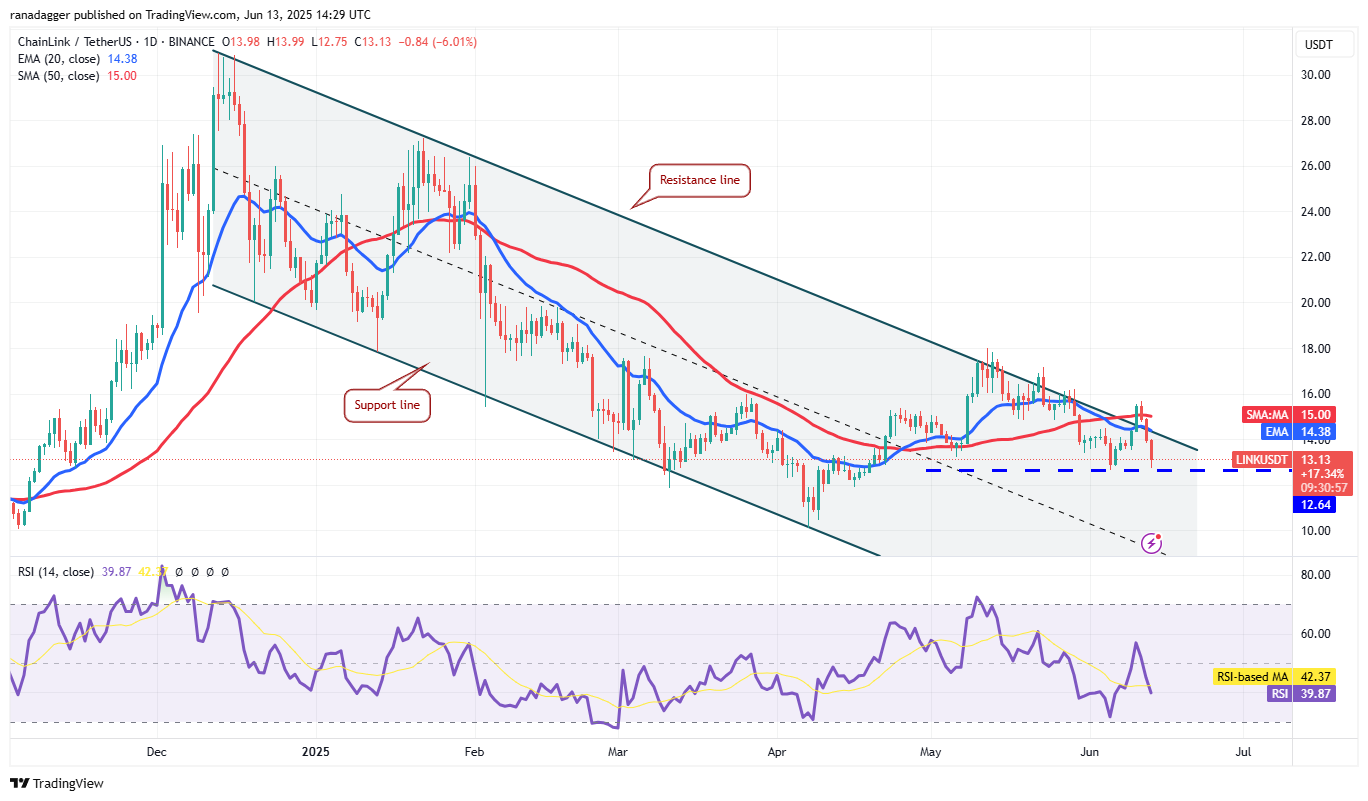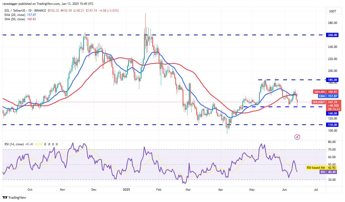 The price turned down from $168 on Wednesday and broke below the moving averages on June 12. The SOL/USDT pair has reached the $140 support, which is a critical level for the bulls to defend.