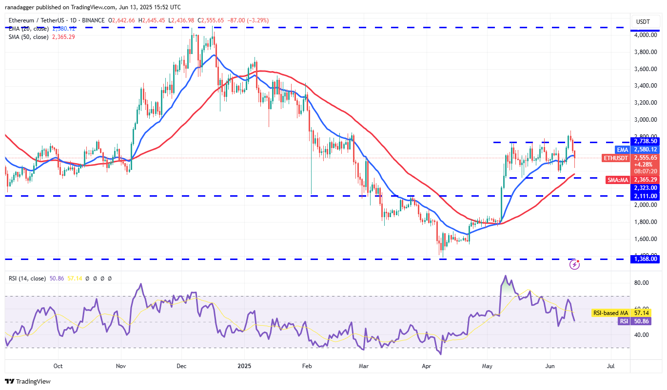 The 20-day EMA is flattening out, and the RSI has dropped to the midpoint, indicating a balance between supply and demand. If the price turns up from the current level or $2,323, the bears will attempt to halt the relief rally in the $2,738 to $2,879 zone. If the price turns down from the overhead zone, the ETH/USDT pair may consolidate for some more time.