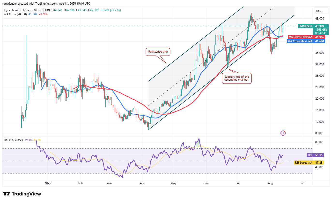 The flattish moving averages and the RSI just above the midpoint do not give a clear advantage either to the bulls or the bears. If buyers achieve a close above the support line, the HYPE/USDT pair could rally to $50. Sellers will try to halt the up move at $50, but the rally could extend to the resistance line of the channel near $64 if the bulls prevail.
