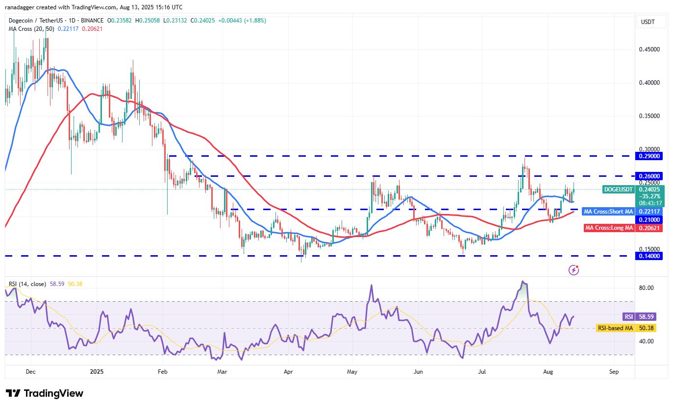 The price bounced off the 20-day SMA ($0.22) on Tuesday, indicating that the buyers are trying to take charge. There is resistance at $0.25, but if the level is crossed, the DOGE/USDT pair could rise to $0.29. Sellers are expected to defend the $0.29 level with all their might because a close above it opens the doors for a potential rally to $0.44.