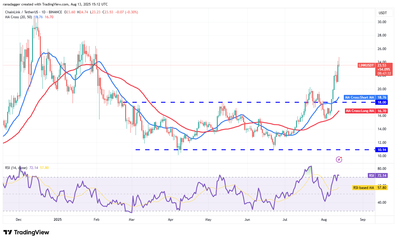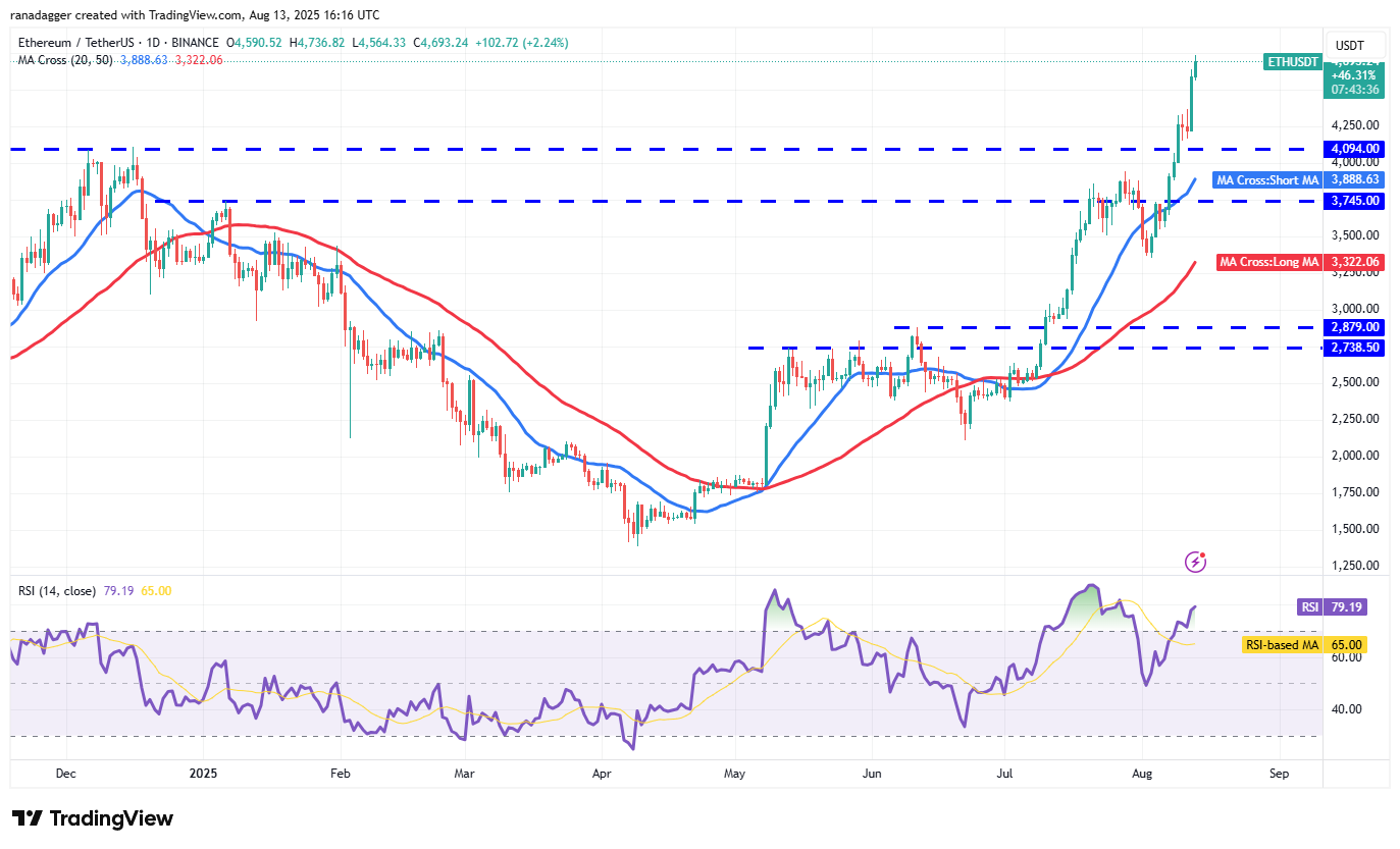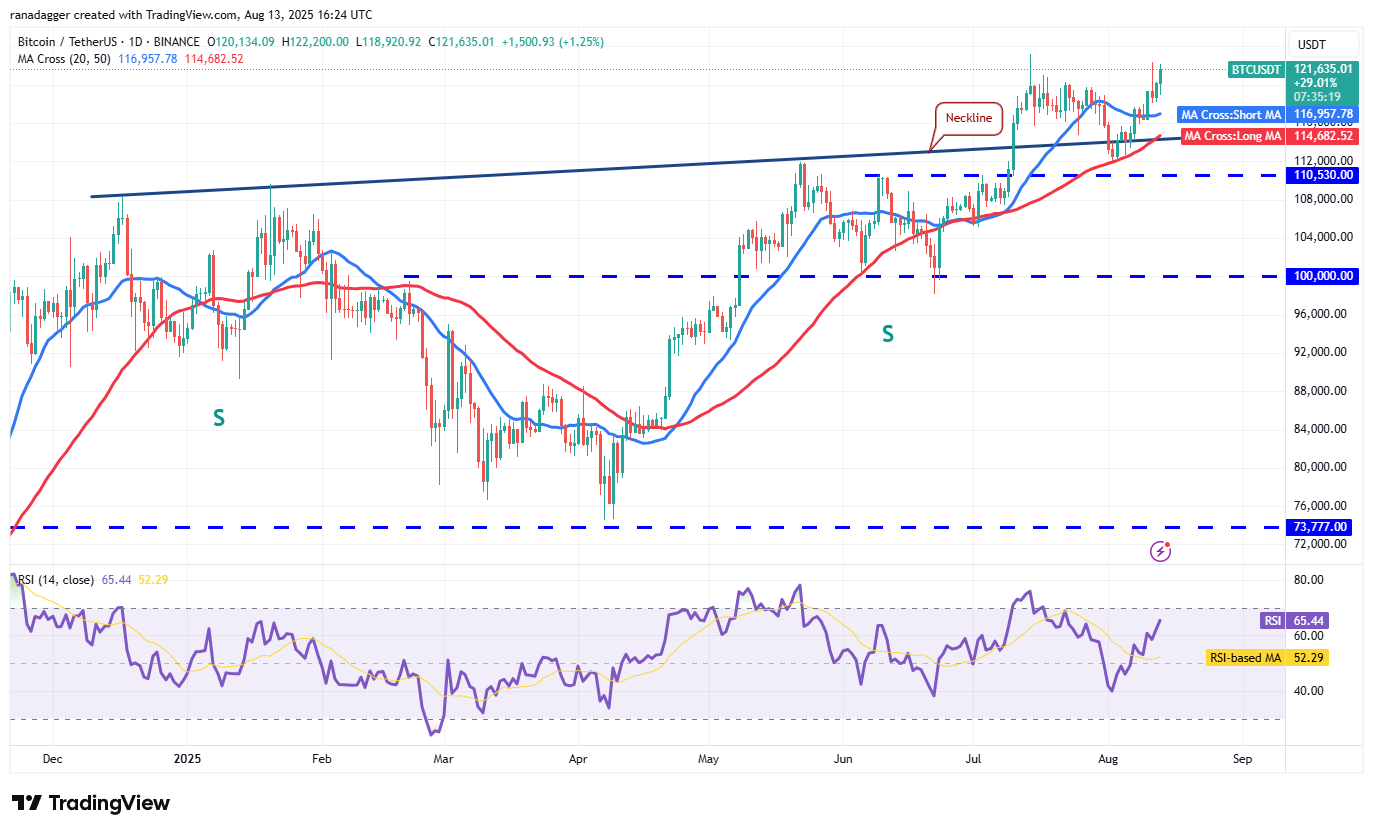 The flattish 20-day simple moving average (SMA) ($116,957) signals a balance between supply and demand, but the relative strength index (RSI) above 65 indicates positive momentum. That increases the likelihood of a break above $123,218. The BTC/USDT pair could then surge toward $135,000.