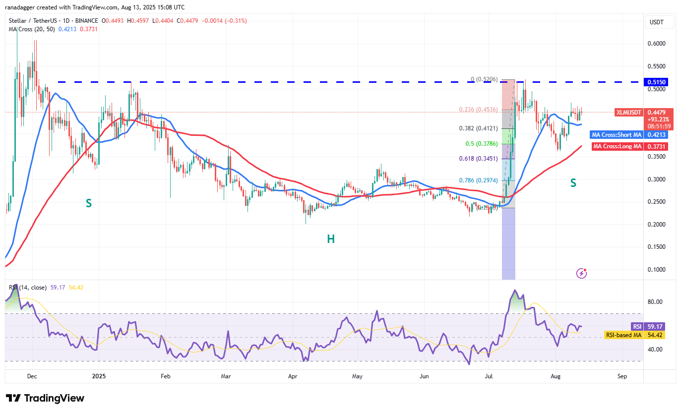The 20-day SMA is flattish, but the RSI is in the positive territory, indicating that the momentum favors the bulls. If buyers push the price above $0.47, the XLM/USDT pair could surge toward $0.52. The Stellar price will complete a bullish inverse head-and-shoulders pattern on a close above $0.52.