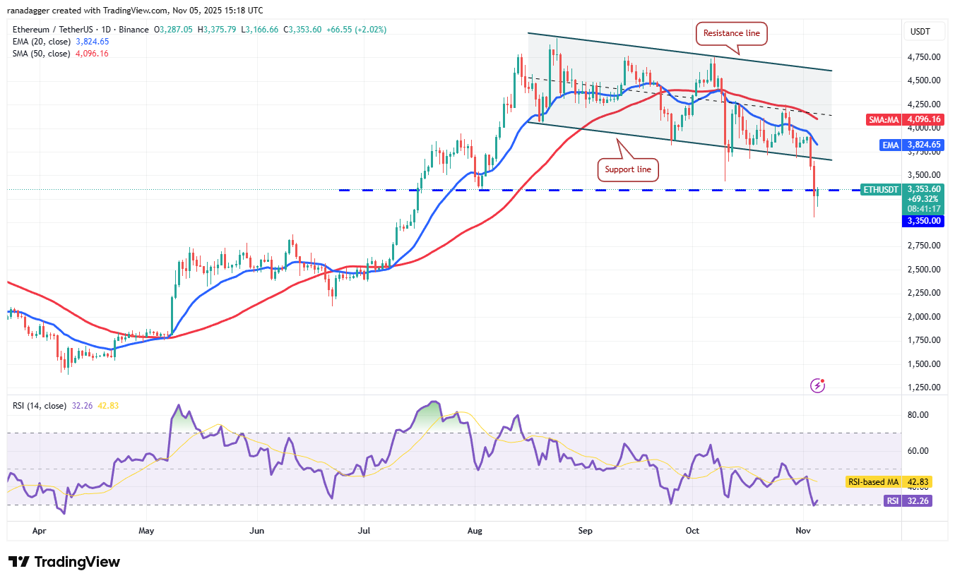 The selling accelerated on Tuesday, and the Ether price slipped below the $3,350 support. Lower levels attracted buying, but the relief rally is expected to face selling near the support line of the channel.