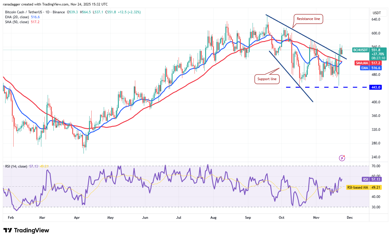Bitcoin Cash (BCH) turned up sharply from the $443 support on Friday and soared above the resistance line of the falling wedge pattern.