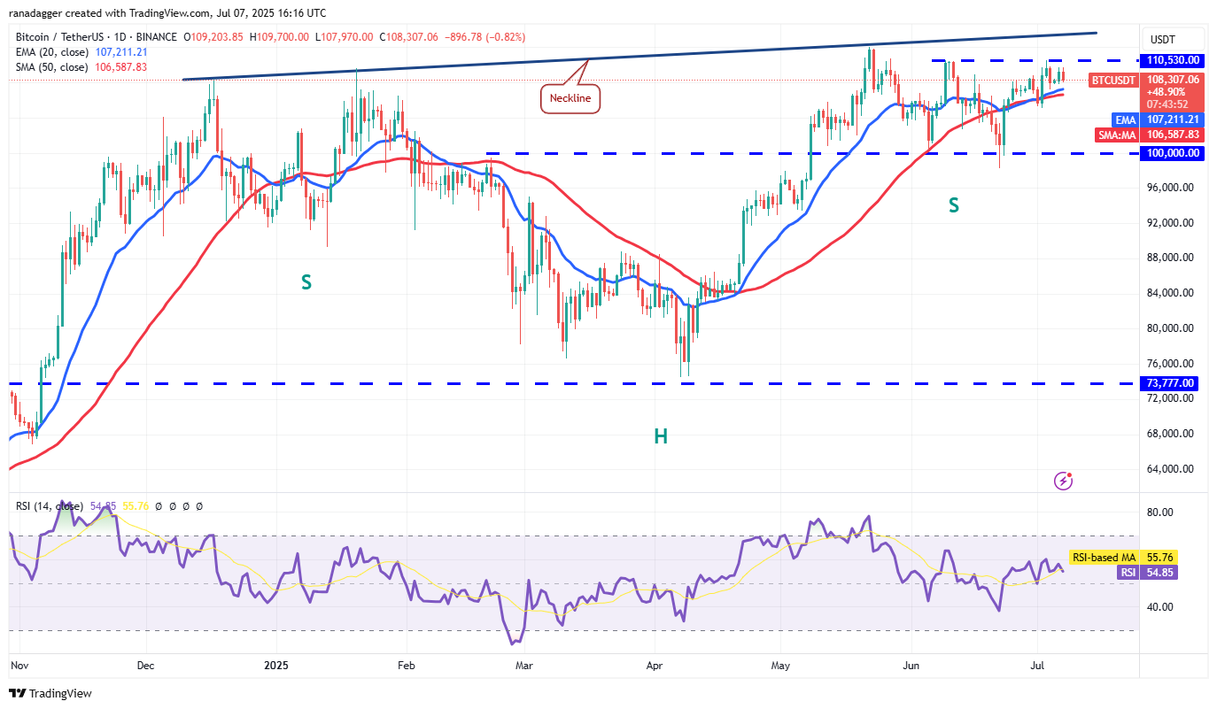 Bitcoin (BTC) continues to face selling near the $110,500 level, indicating that the bears are vigorously defending the level. A positive sign in favor of the bulls is that they have not allowed the price to dip below the moving averages. That suggests the bulls are hanging on to their positions and not hurrying to book profits.