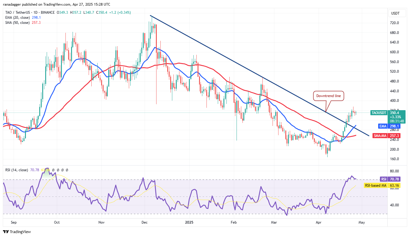 The up move is facing resistance at $375, but the pullback is expected to find support at the 20-day EMA ($298). A solid bounce off the 20-day EMA signals a change in sentiment from selling on rallies to buying on dips. The bulls will then attempt to drive the TAO/USDT pair above $375. If they succeed, the next stop may be $495.