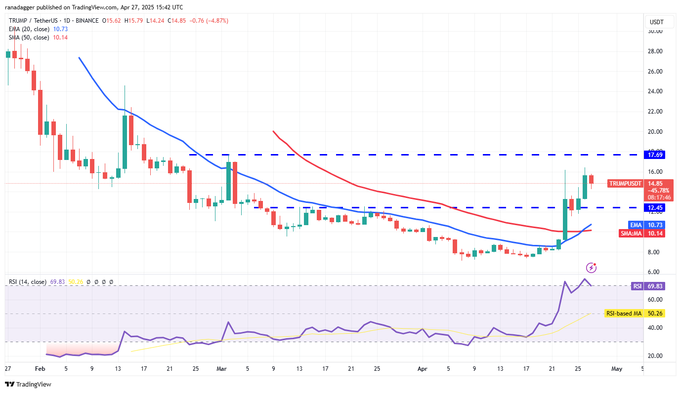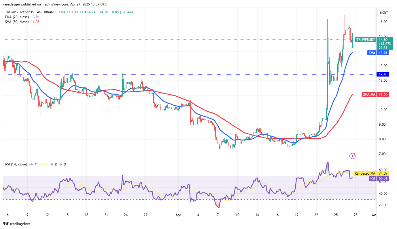A rally above $16 is attracting sellers, but a shallow pullback suggests that every minor dip is being purchased. If buyers drive the price above $16, the TRUMP/USDT pair may reach $17.69, where the bears are expected to mount a strong defense. However, if buyers bulldoze their way through, the pair could skyrocket to $19.60 and then to $22.40.