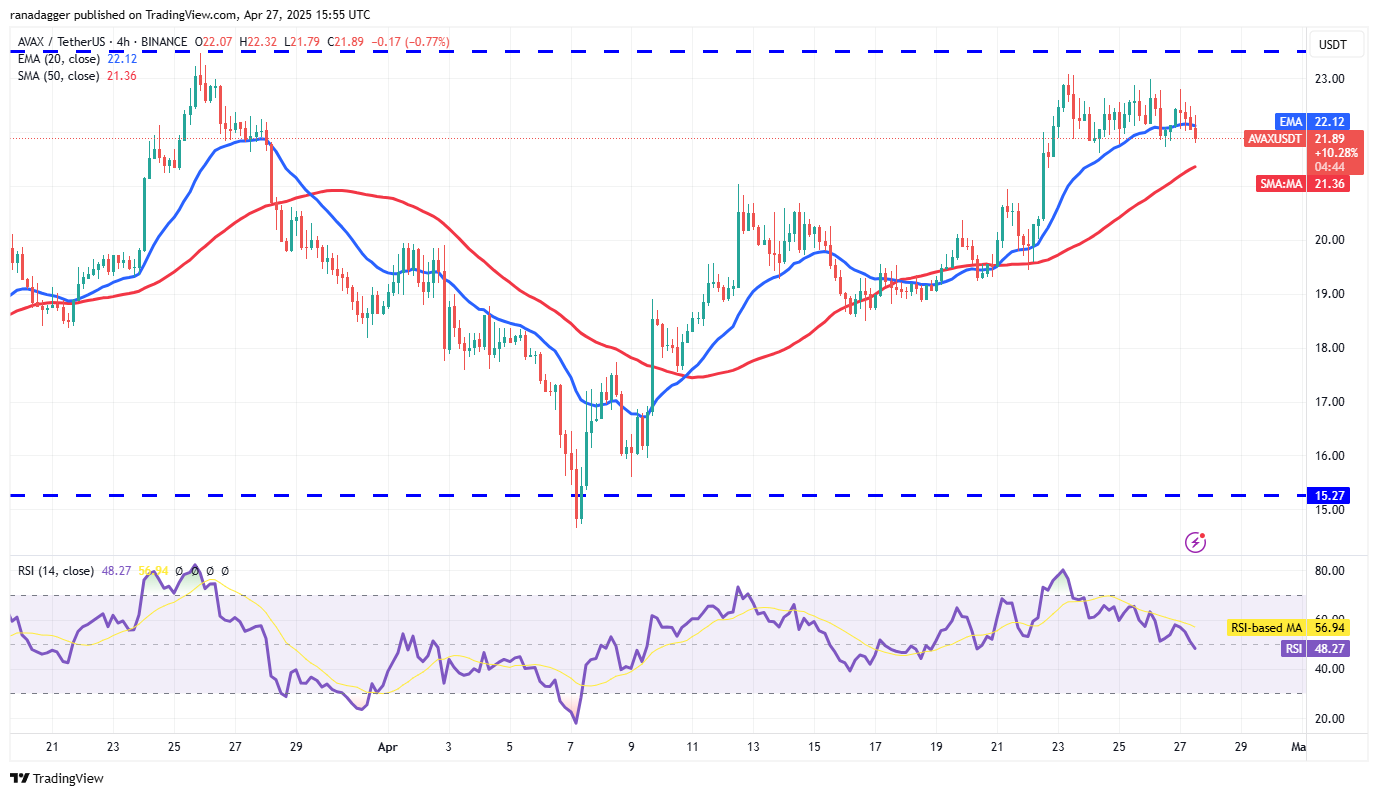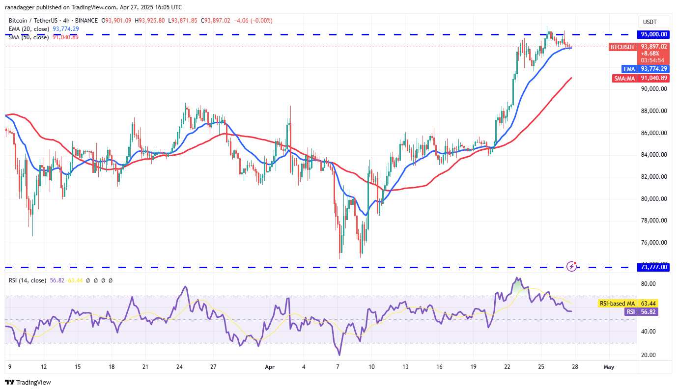 The 4-hour chart shows the bears are fiercely defending the $95,000 level but are struggling to sink the pair below the 20-EMA. If the price rebounds off the 20-EMA, it enhances the prospects of a break above $95,000. The pair could then surge to $100,000.