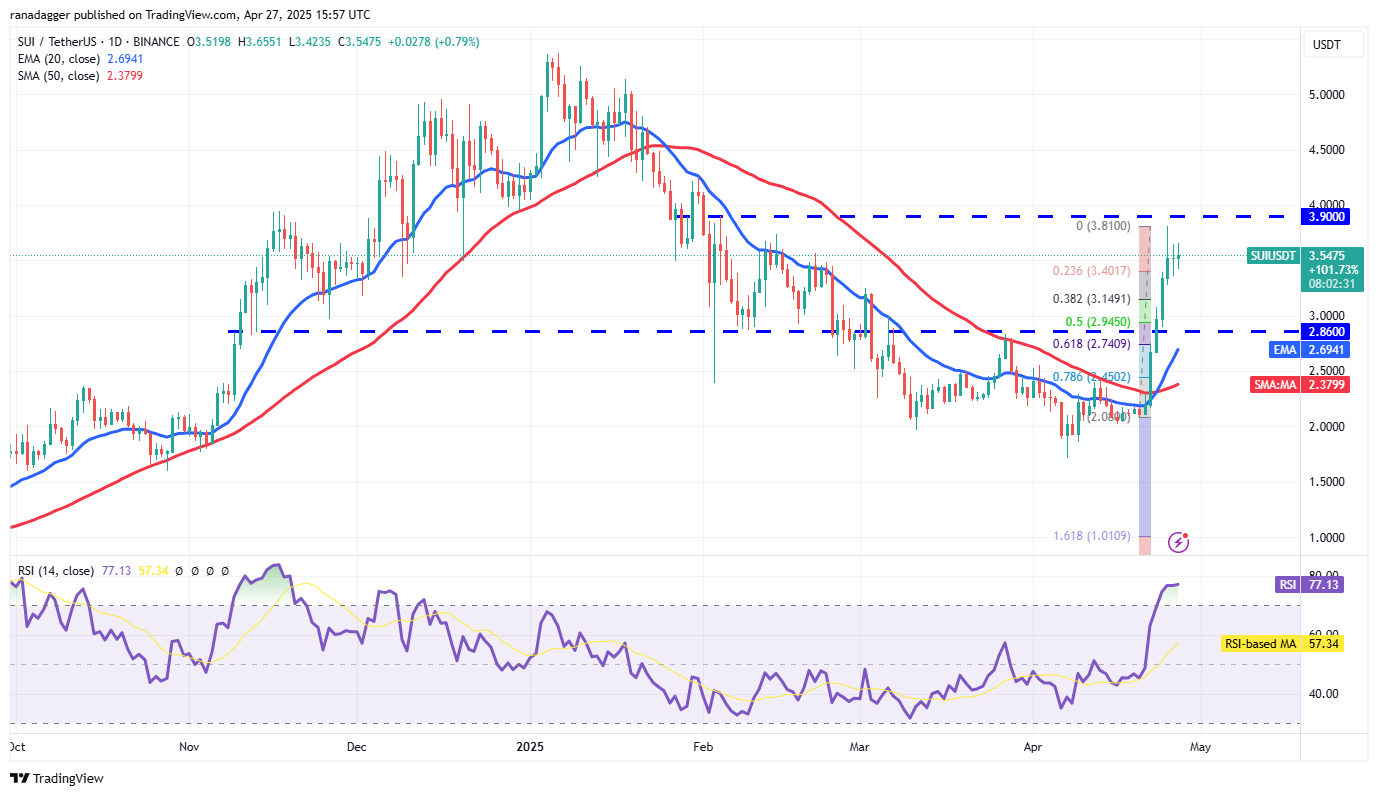 If the price stays above the 38.2% Fibonacci retracement level of $3.14, the bulls will make another attempt to shove the SUI/USDT pair above $3.90. If they can pull it off, the pair may skyrocket to $4.25 and then to $5.