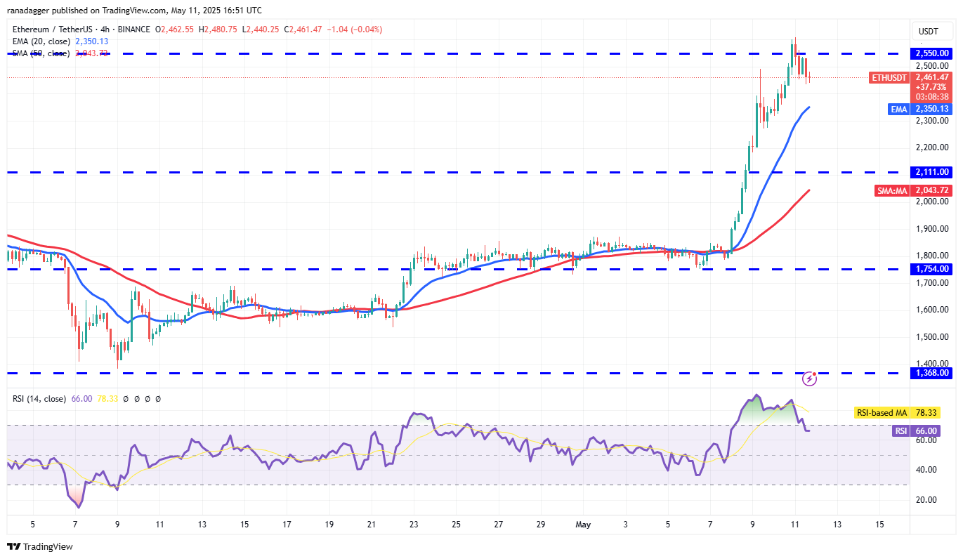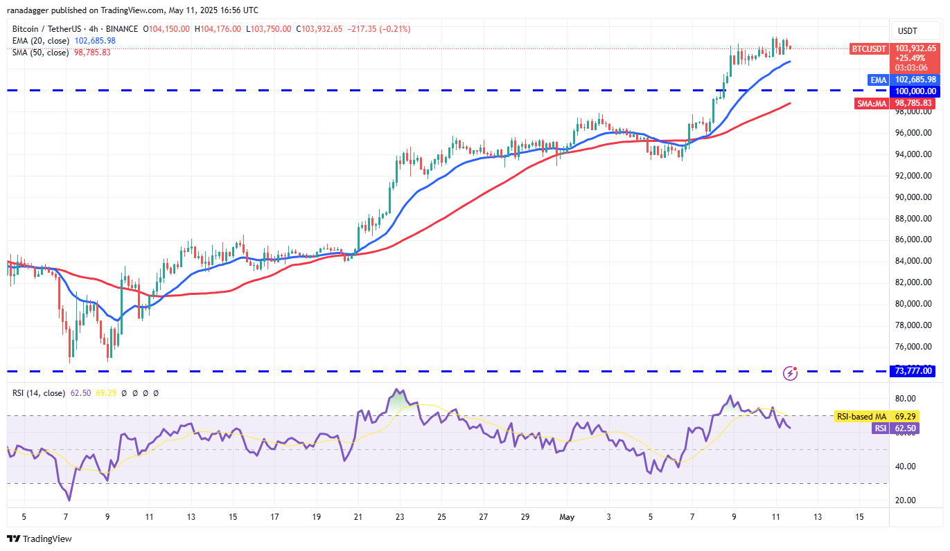 The pair continues to climb higher, but the bears are expected to fiercely defend the $107,000 to $109,588 zone. If the price turns down from the overhead zone, the 20-EMA is likely to act as strong support. A bounce off the 20-EMA signals that the bullish momentum remains intact. That enhances the prospects of a breakout above $109,588.