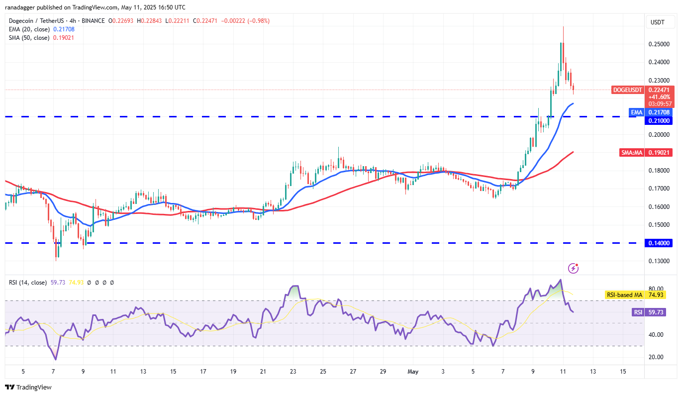 If buyers want to prevent the upside, they will have to pull the price below the 20-day EMA ($0.19). If they do that, the DOGE/USDT pair could swing inside a large range between $0.26 and $0.14 for a while.