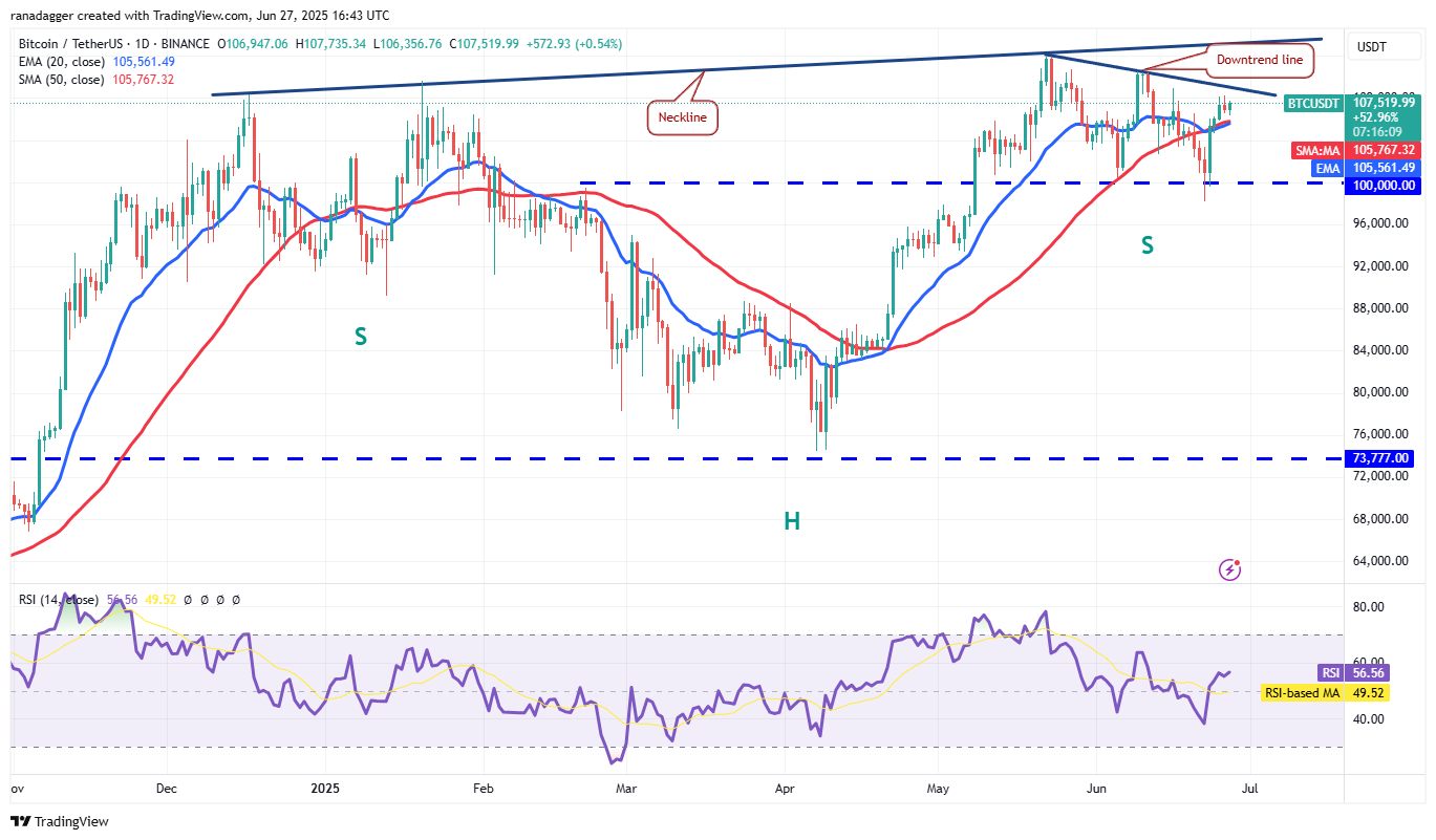 The 20-day exponential moving average ($105,561) is sloping up gradually, and the relative strength index (RSI) is just above the midpoint, signaling that bulls have an edge. If buyers drive the price above the downtrend line, the developing descending channel pattern will be invalidated. That could catapult the price to the neckline of the inverse head-and-shoulders pattern near $114,000. A break and close above the neckline will complete the bullish setup, which has a target objective of $150,492.