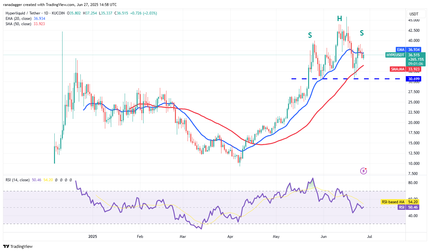 Hyperliquid (HYPE) is witnessing a tough battle between the bulls and the bears near the 20-day EMA ($36.93).