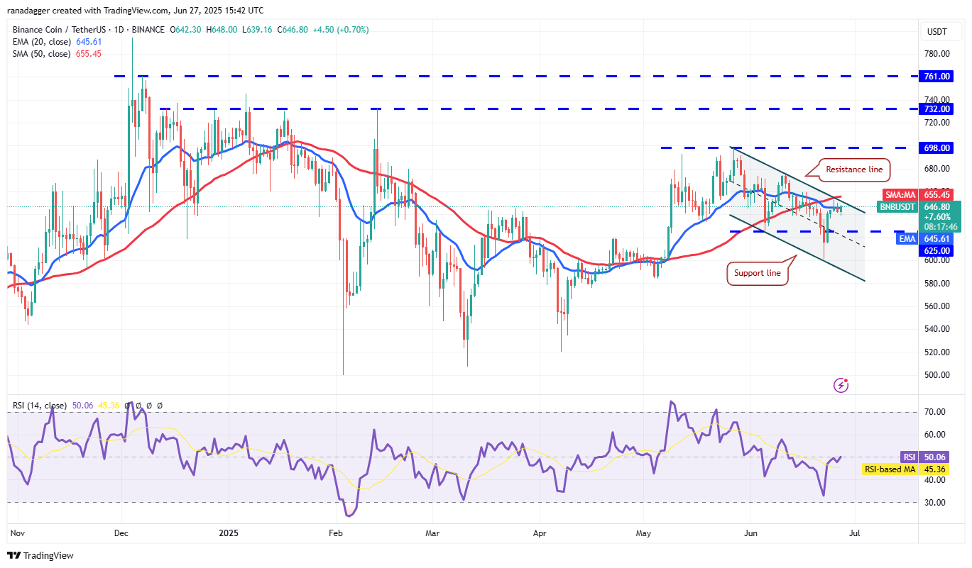 That suggests the bulls are not hurrying to exit their positions. That enhances the prospects of a break above the resistance line. If that happens, the BNB/USDT pair could rally to $675 and, after that, to $698.