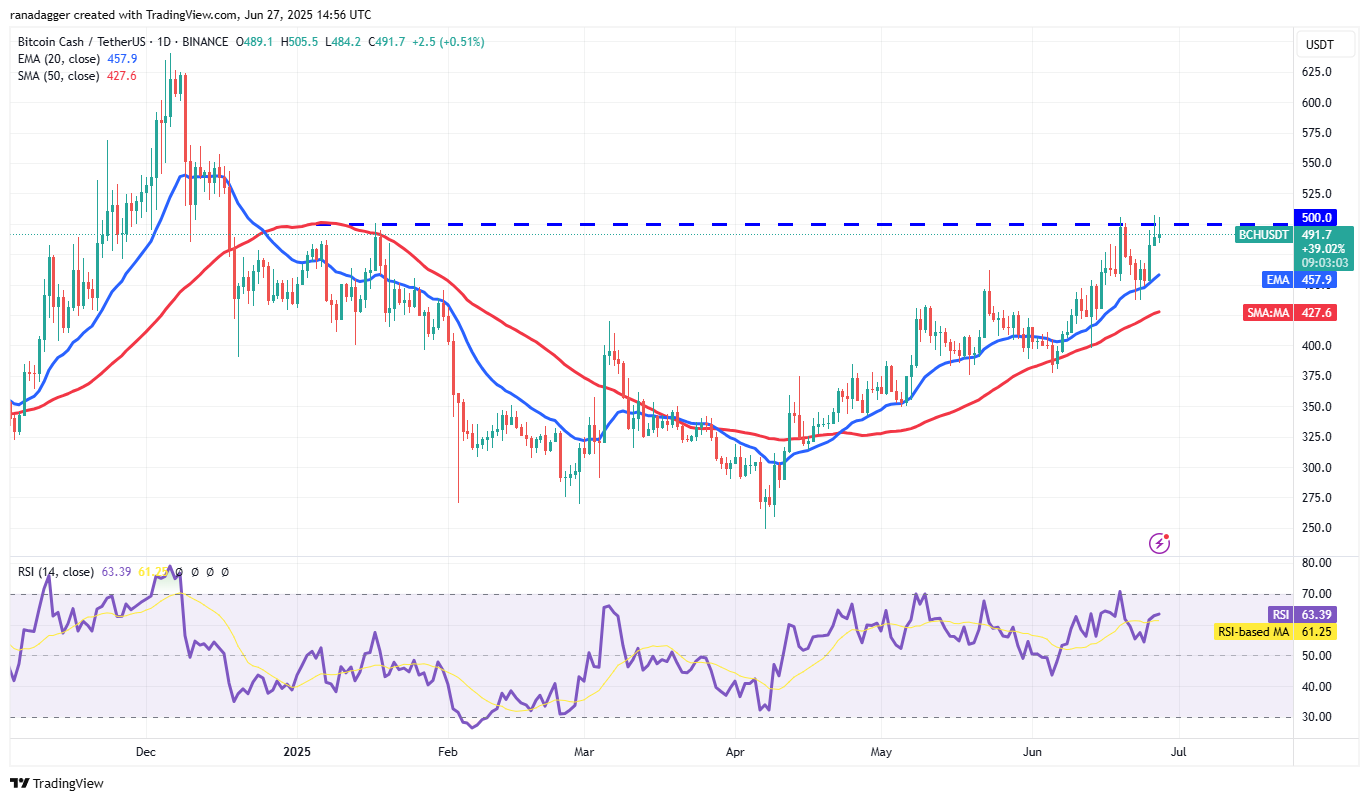 Contrarily, if the price turns down sharply from $500, it suggests that the bears are aggressively defending the level. The pair could then pull back to the 20-day EMA ($457), likely attracting buyers.