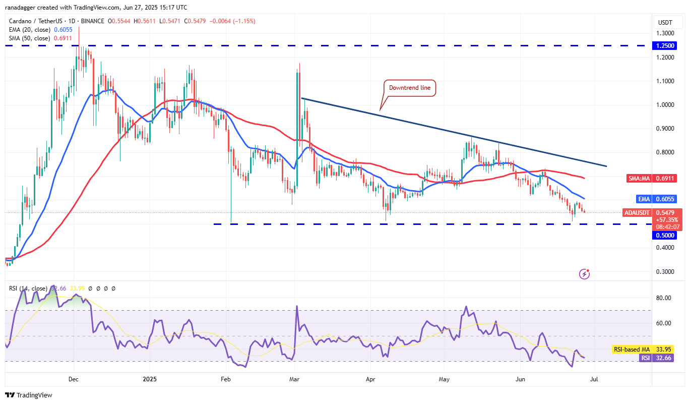 Sellers will try to pull the price below the $0.50 support, but the bulls are expected to mount a strong defense of the level. The first sign of strength will be a break and close above the 20-day EMA. The ADA/USDT pair may then climb to the 50-day SMA ($0.69) and later to the downtrend line.