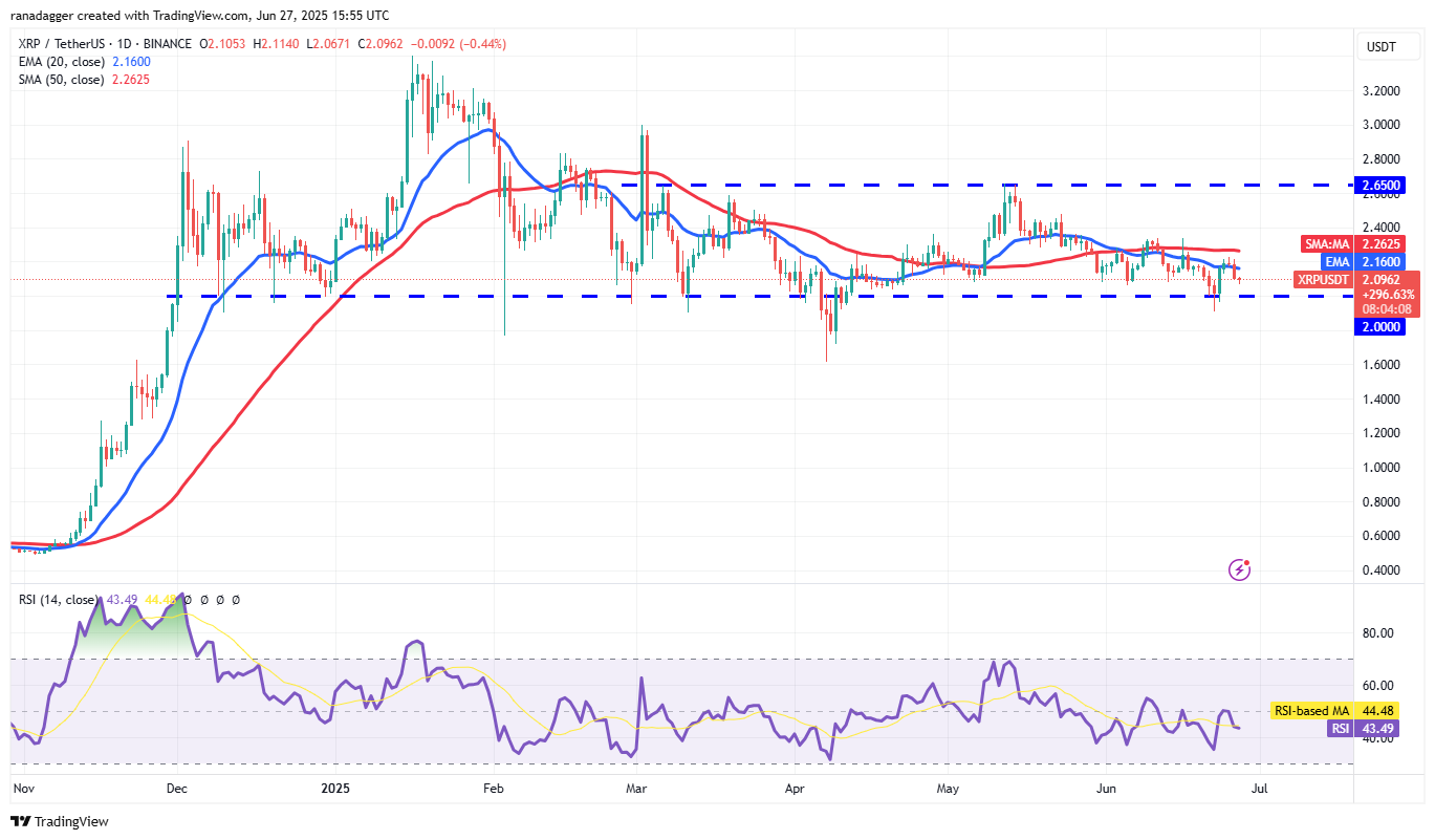 Buyers failed to push XRP (XRP) above the 50-day SMA ($2.26), indicating a lack of demand at higher levels.