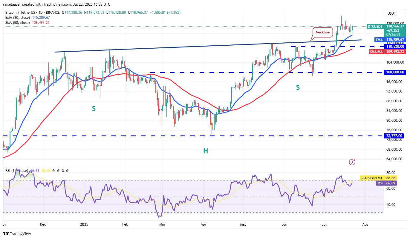 Bitcoin (BTC) continues to face selling near $120,000, but a positive sign is that the bulls have not allowed the price to dip below $115,000 in the past few days. That suggests the bulls are buying every minor dip and have kept up the pressure.