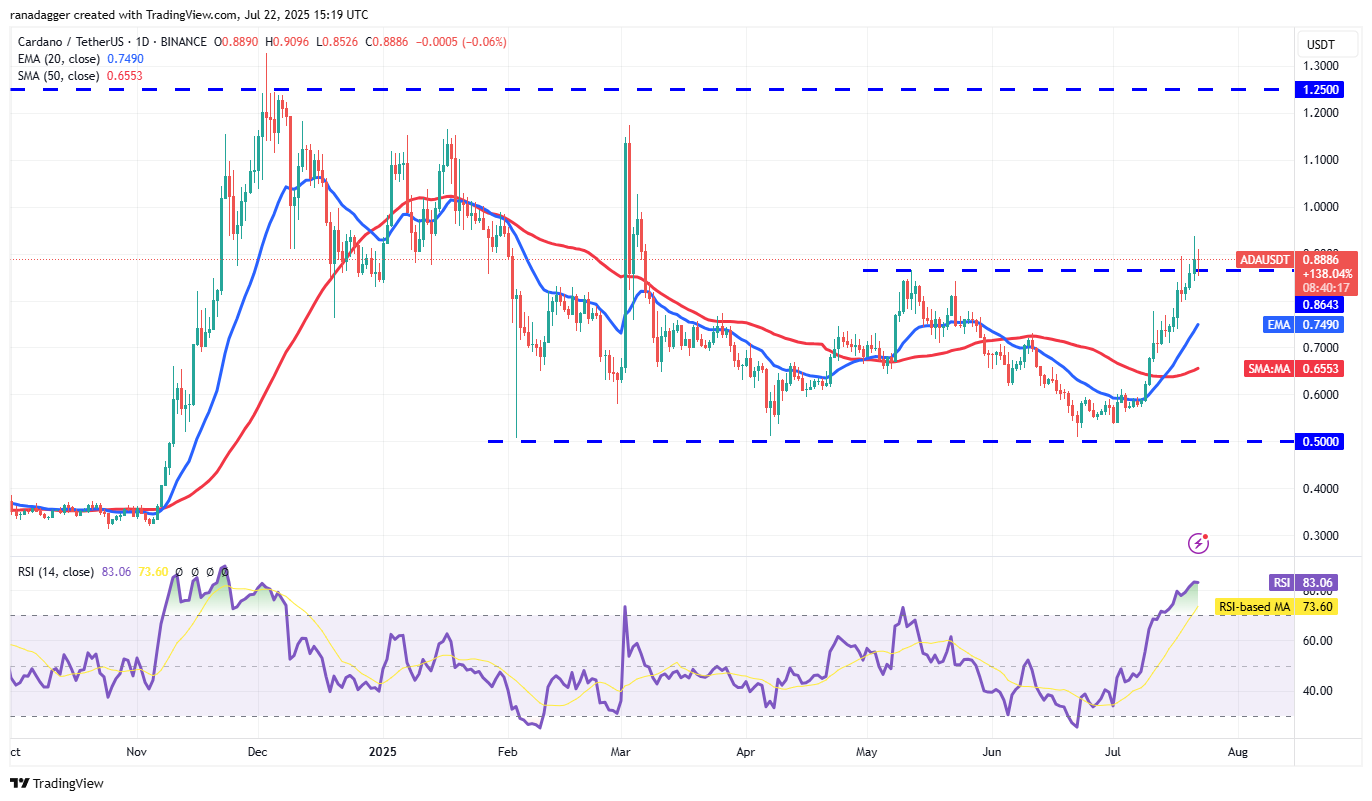 The bears are trying to pull the price back below $0.86. If they do that, the ADA/USDT pair could descend to the 20-day EMA ($0.74). This is an essential level for the bulls to defend because a break below the 20-day EMA could deepen the correction to the 50-day SMA ($0.65).