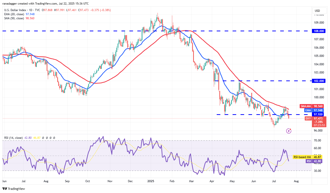 The bears have strengthened their position by pulling the price below the 20-day EMA ($97.94). That clears the path for a fall to 97.17 and then to the critical 96.37 level.