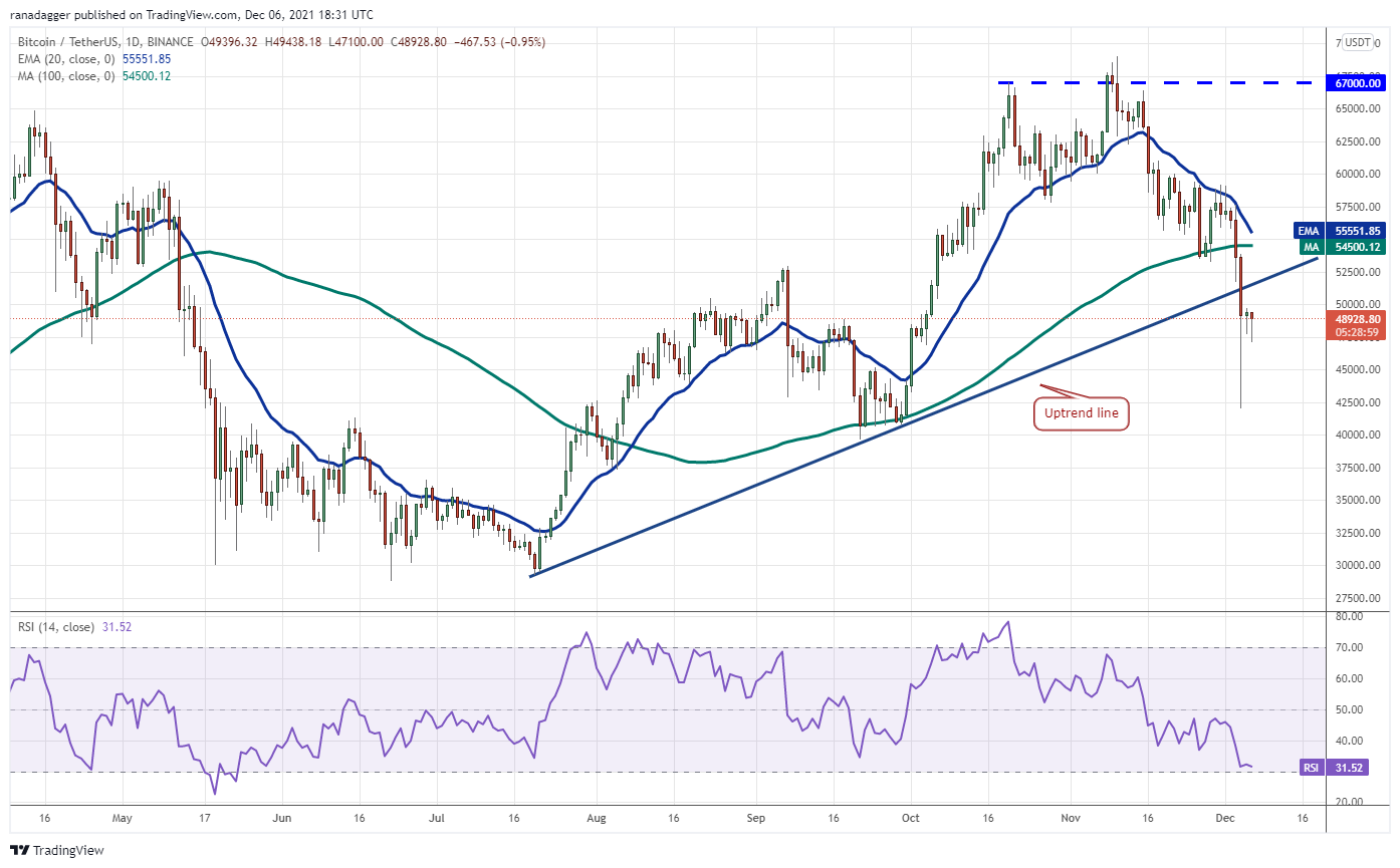 Bitcoin broke under the uptrend line and the psychological assist at $50,000, which can have resulted in panic promoting by merchants. Though bulls bought the dip aggressively, they’re discovering it tough to push the worth above $50,000.