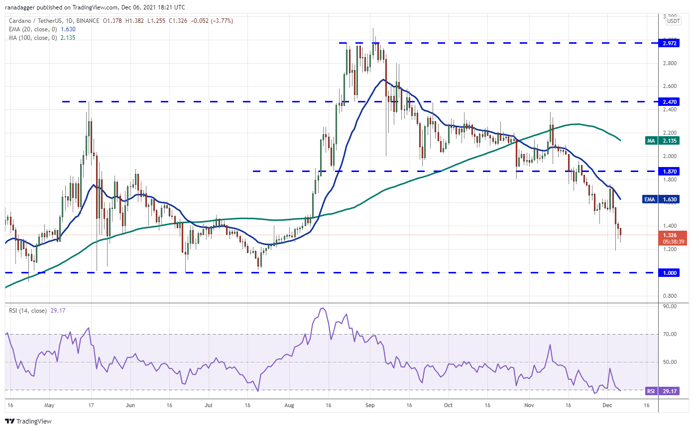 Cardano (ADA) turned down from the 20-day EMA ($1.63) on Dec. 3, indicating that sentiment stays destructive and merchants are promoting on rallies.