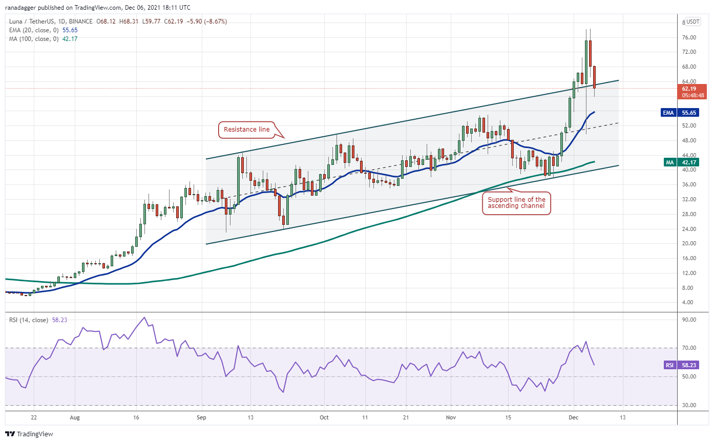 The bears tried to drag the worth again into the ascending channel on Dec. 6 however the bulls are more likely to defend this stage with vigor. The upsloping 20-day EMA ($55) and the RSI within the constructive zone point out the benefit to patrons.