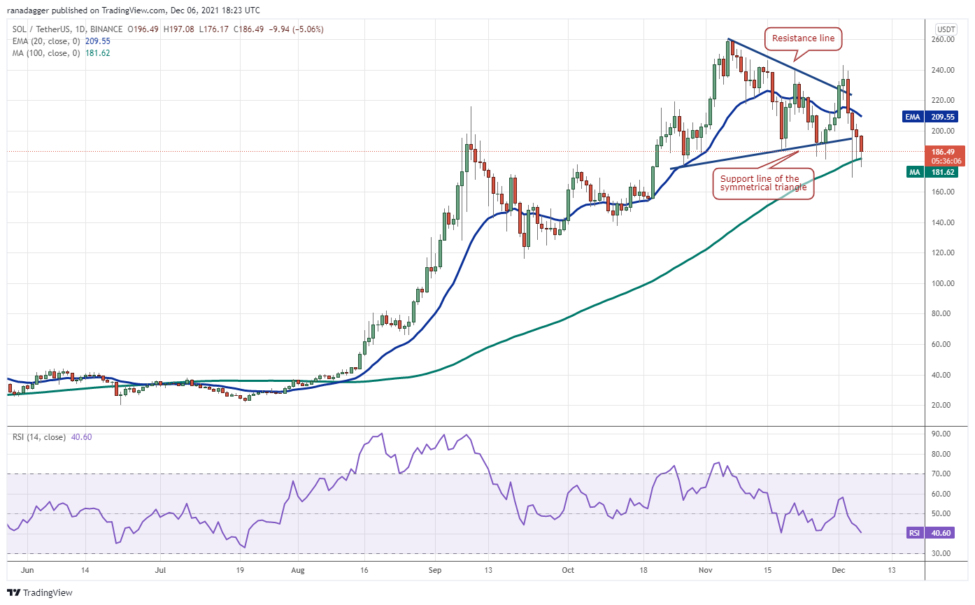 The promoting picked up momentum after the SOL/USDT pair broke and closed under the 20-day EMA ($209). The bears pulled the worth under the assist line of the triangle and the 100-day SMA ($181) on Dec. 4.