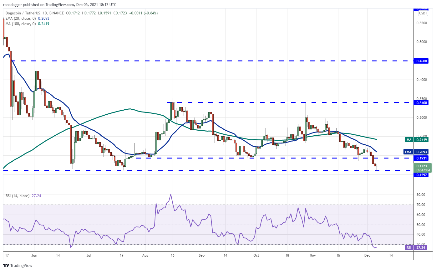 Dogecoin (DOGE) plunged under the essential assist at $0.15 on Dec. 4 however bulls bought this dip as seen from the lengthy tail on the candlestick. The failure of the patrons to push the worth to the overhead resistance at $0.19 signifies an absence of demand at larger ranges.