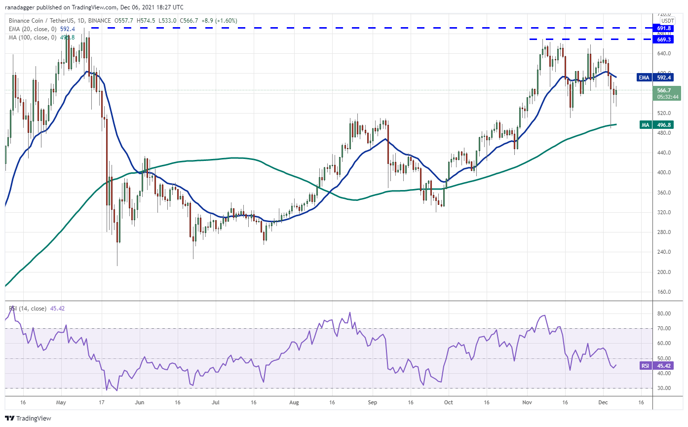 Binance Coin (BNB) broke and closed under the 20-day EMA ($592) on Dec. 3. That was adopted by a pointy sell-off on Dec. 4, which pulled the worth to the 100-day SMA ($496).