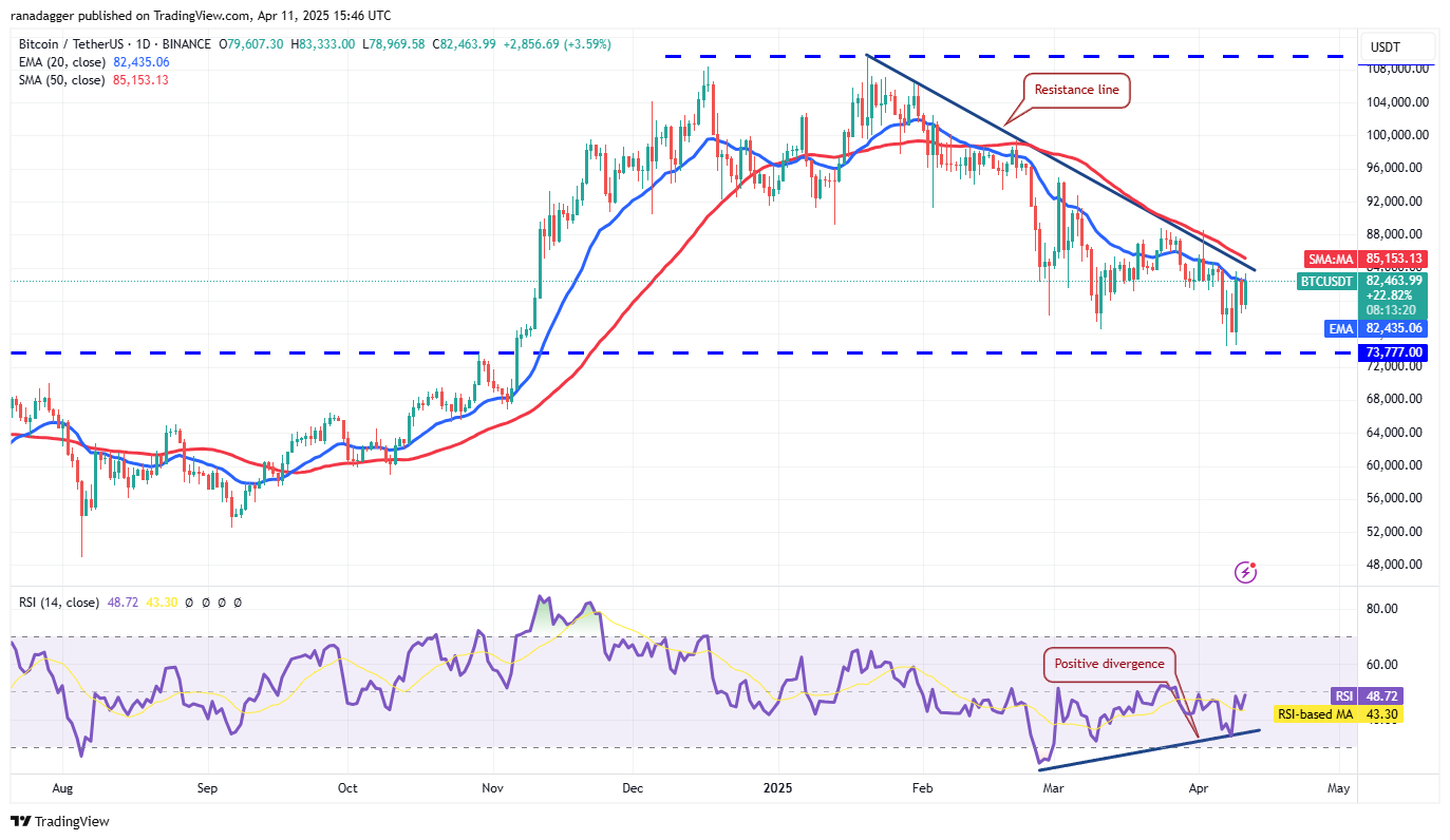 The 20-day exponential moving average ($82,435) is turning down, but the relative strength index (RSI) has risen close to the midpoint, indicating that the bearish momentum is weakening. The BTC/USDT pair is expected to face intense selling at the resistance line, but if the bulls prevail, the rally could reach $89,000 and then $95,000.