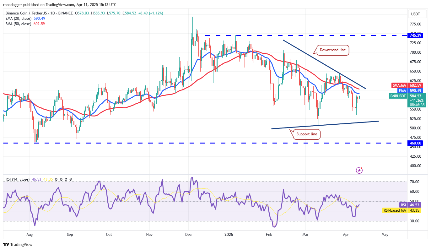 BNB (BNB) has reached the 20-day EMA ($590), which is an important near-term resistance to watch out for.