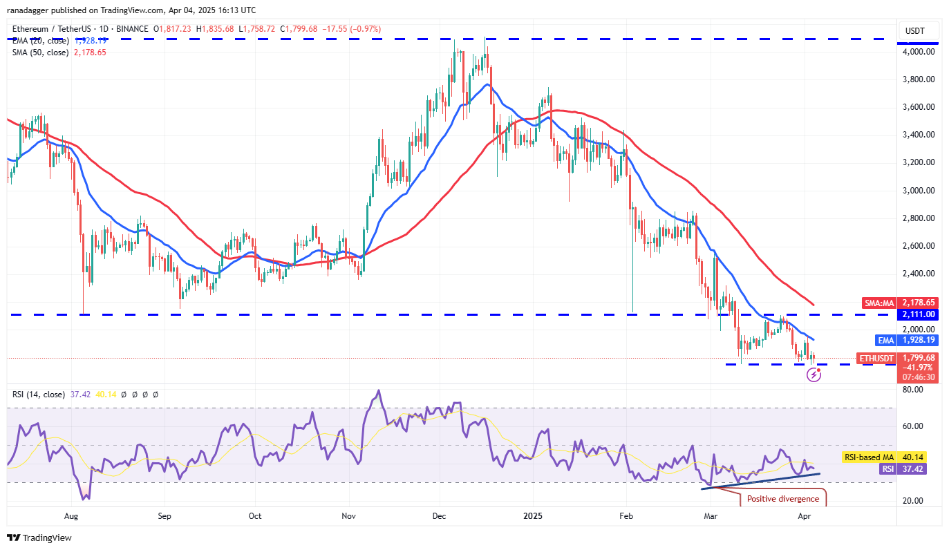A minor positive in favor of the bulls is that the relative strength index (RSI) has formed a positive divergence. That suggests the bearish momentum may be weakening. If the price rebounds off $1,754, the pair could face selling at the 20-day EMA. However, if buyers overcome the obstacle, the pair could rally to $2,111. A short-term trend reversal will be signaled on a close above $2,111.