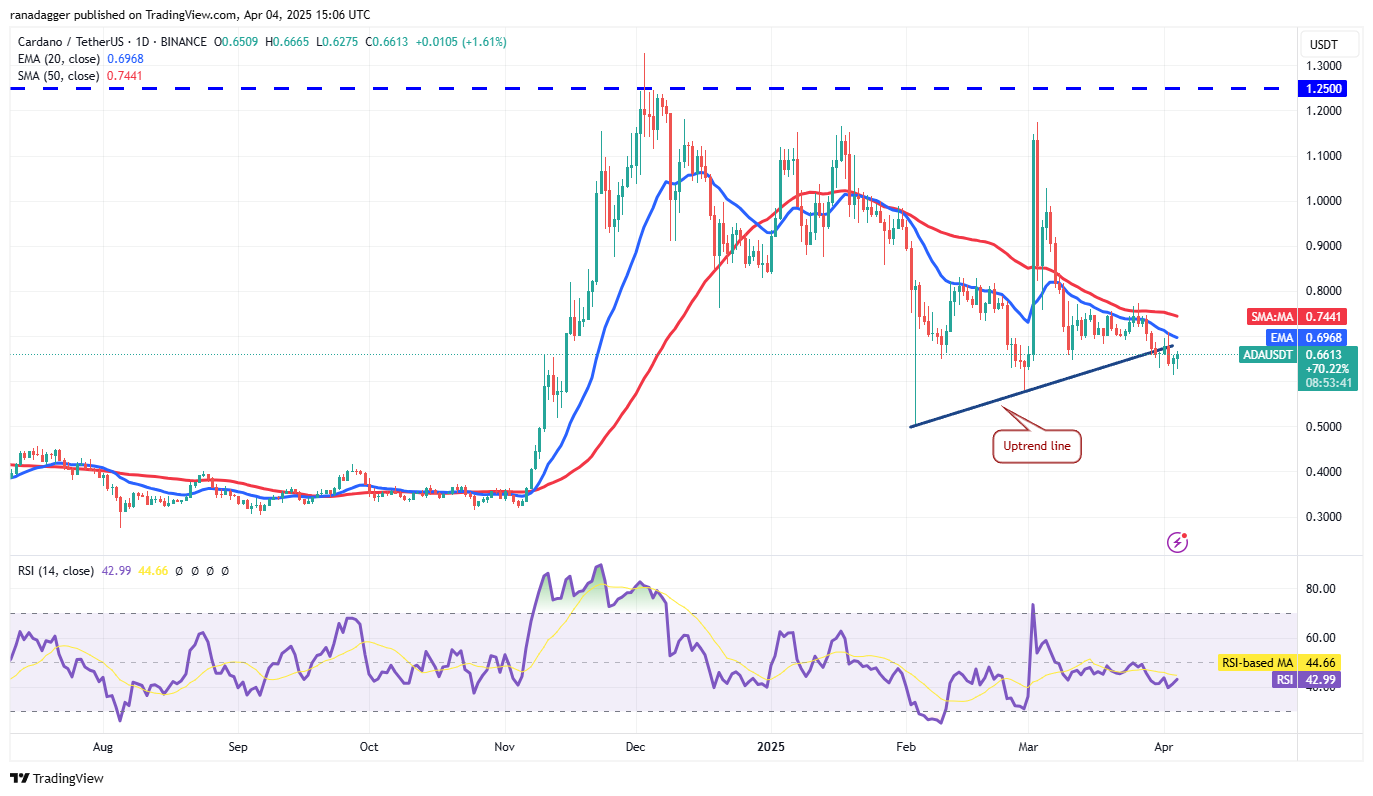 Cardano (ADA) turned down sharply from the 20-day EMA ($0.69) on April 2 and closed below the uptrend line.