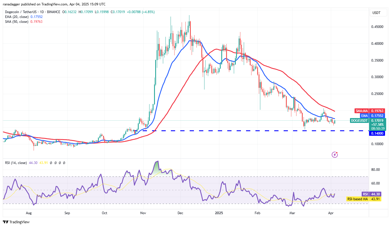 Dogecoin (DOGE) bears thwarted attempts by the bulls to push the price above the 20-day EMA ($0.17) on April 2.