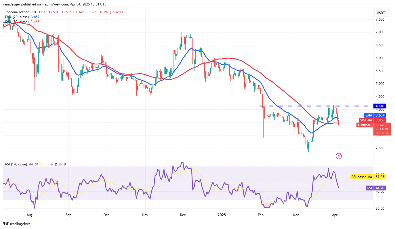 The TON/USDT pair broke below the 20-day EMA ($3.65) on April 3, indicating that the bullish momentum is weakening. There is support at $3.32, but if the level cracks, the pair may drop to $2.81.