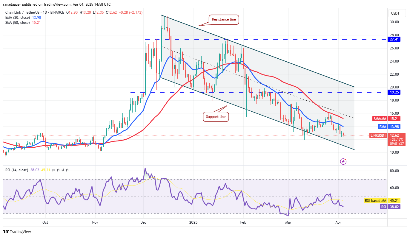 The LINK/USDT pair has strong support in the zone between $12 and the support line of the descending channel pattern. A rebound off the support zone will have to rise above the moving averages to signal a stronger recovery toward $17.50.