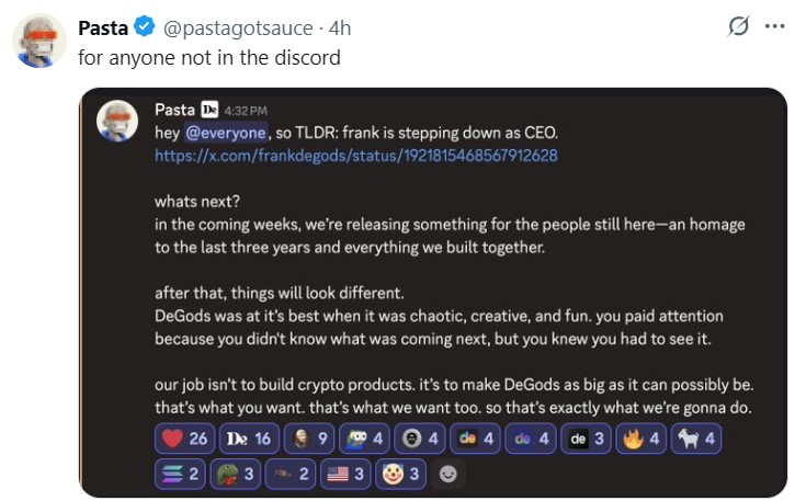 Pasta also hinted that there will be changes in the project’s approach. “Our job isn’t to build crypto products. It’s to make DeGods as big as it can possibly be. That’s what you want. That’s what we want too. So that’s exactly what we’re gonna do,” Pasta wrote.