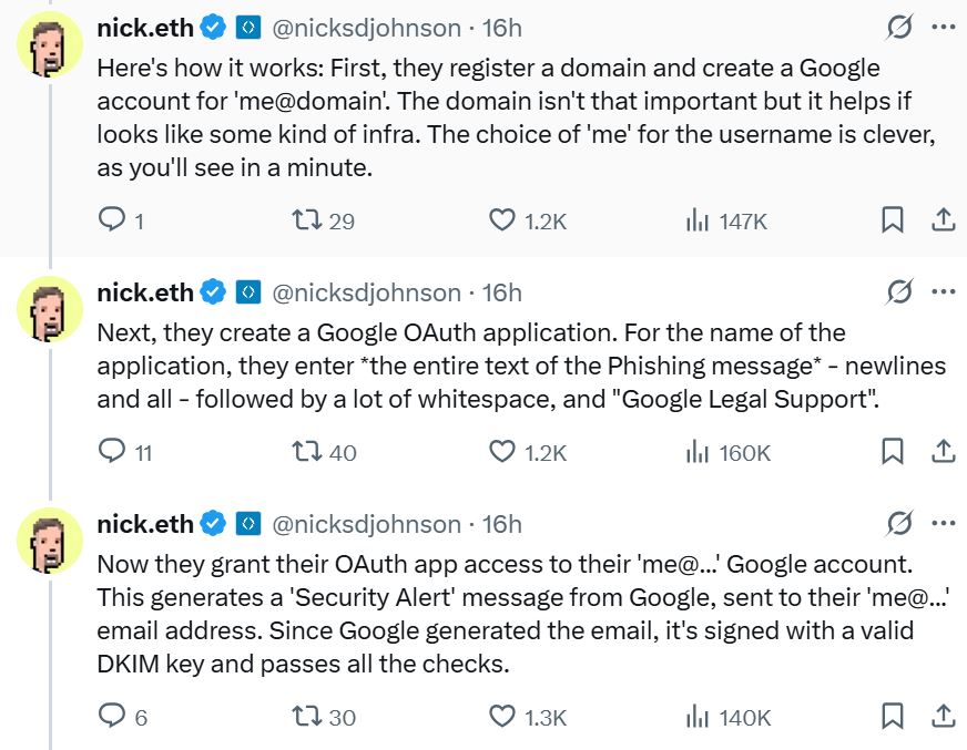 “It passes the DKIM signature check, and GMail displays it without any warnings – it even puts it in the same conversation as other, legitimate security alerts,” he said.