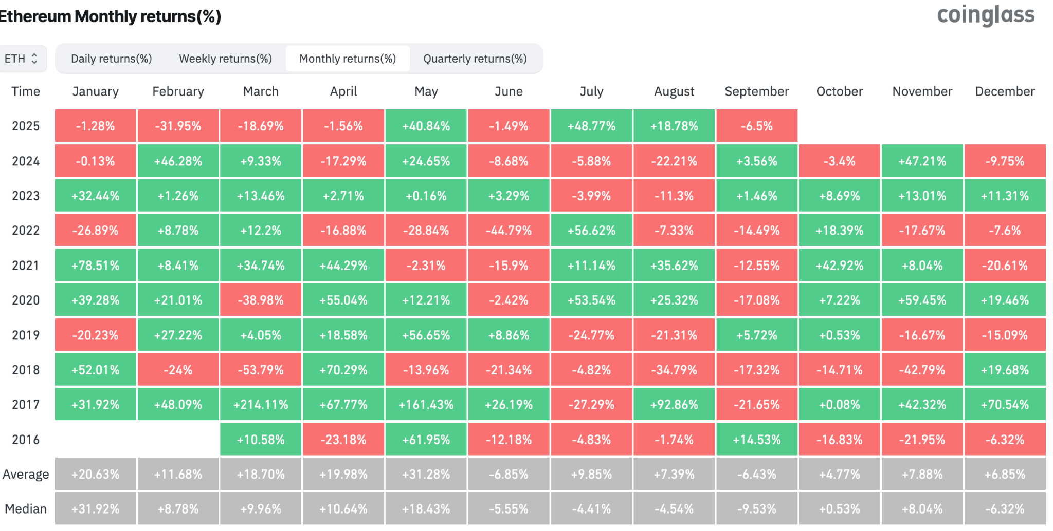 ETH/USD lost 6% in September, which aligns with historical price behavior, according to data from monitoring resource CoinGlass.