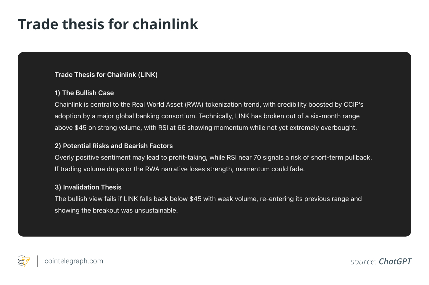 Technical analysis: LINK has broken out of a six-month accumulation range, clearing the $45 resistance level on high volume. The daily RSI is 66.”