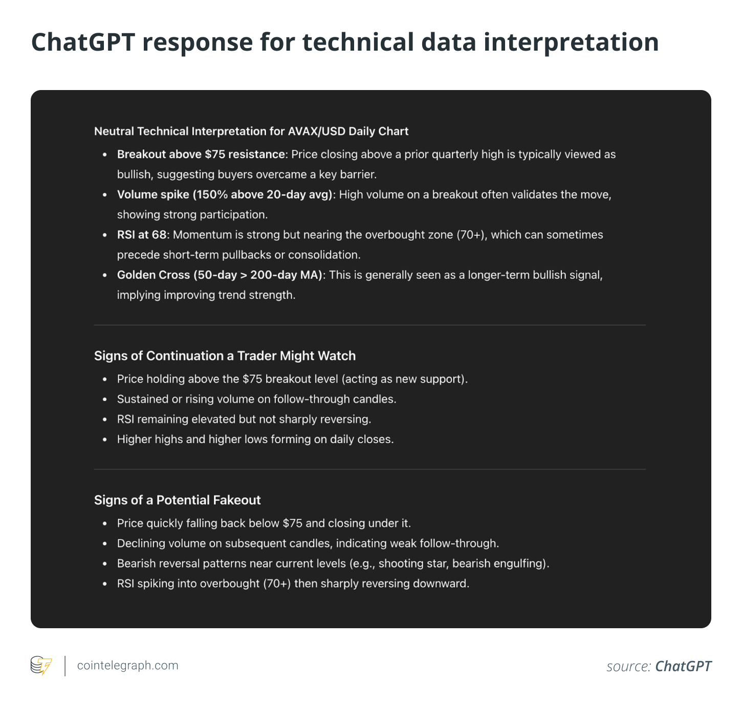 The output gives a neutral read on Avalanche’s (AVAX) chart, showing how traders view the breakout above $75, strong volume, near-overbought RSI and golden cross; it serves as a guide to spot continuation (holding above $75 with strong volume) versus a fakeout (dropping back below on weak volume or reversals) and can be reused as a framework for other charts, without offering financial advice.