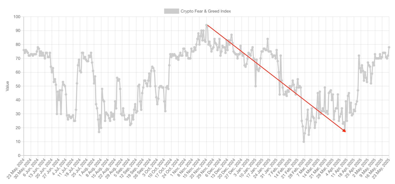 When investors get too “greedy,” the market is often overdue for a correction. The last time this index was at similar levels was at the height of the Trump-driven pump in December 2024, just before BTC dropped down from its then-all-time high of around $108,000 and tumbled toward $74,000 in March.