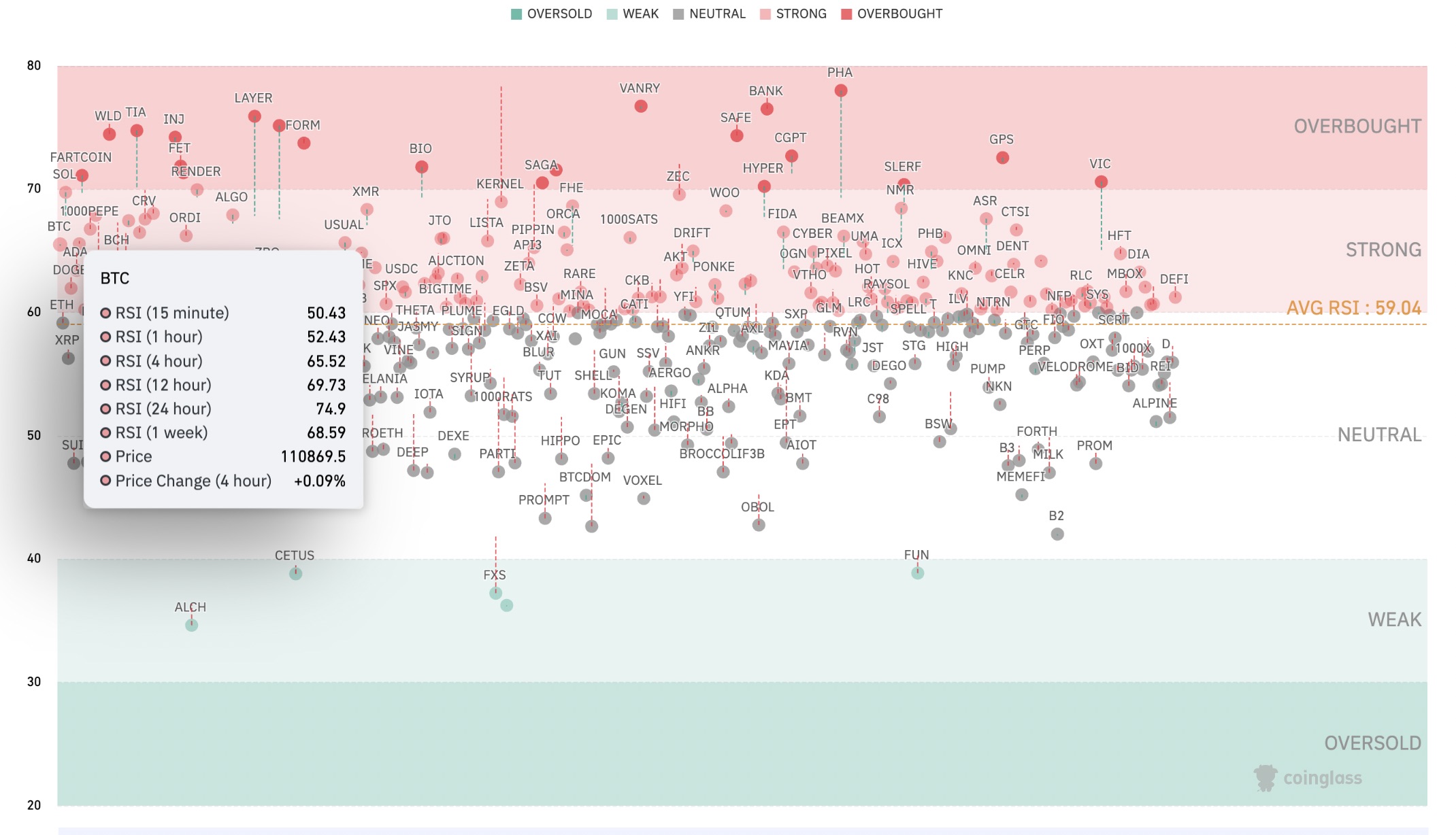Bitcoin’s relative strength index, or RSI, displays overbought conditions in two out of five timeframes. Bitcoin’s RSI is now at 70 in the 12-hour timeframe and 75 on the daily chart. Other intervals show near-oversold RSI values on the weekly and four-hour timeframes.