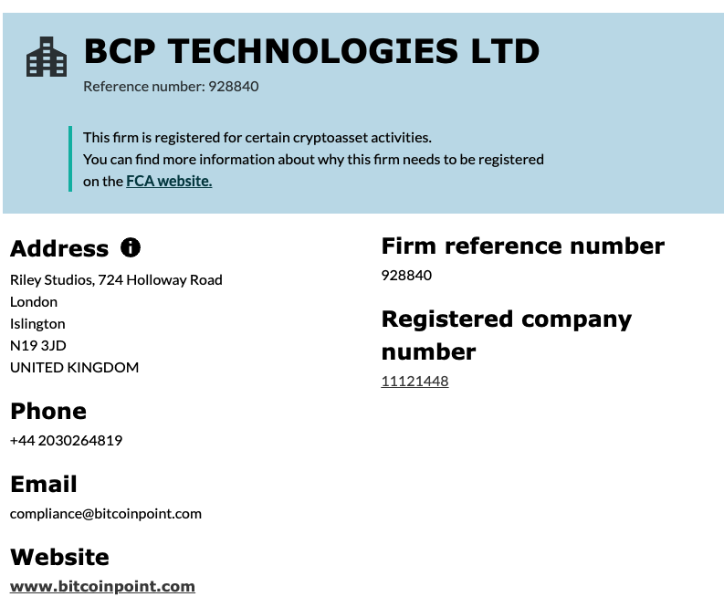 Acting as the issuer, BCP Technologies has been an FCA-registered crypto asset service provider since 2021, formerly known as BitcoinPoint, according to official FCA records.