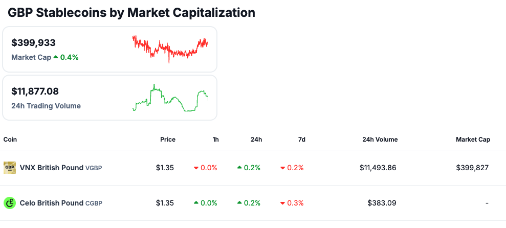 According to data from CoinGecko, there are only two tracked pound stablecoins at the time of writing, including VNX British Pound (VGBP) and Celo British Pound (CGBP), with a combined market cap of less than $500,000.